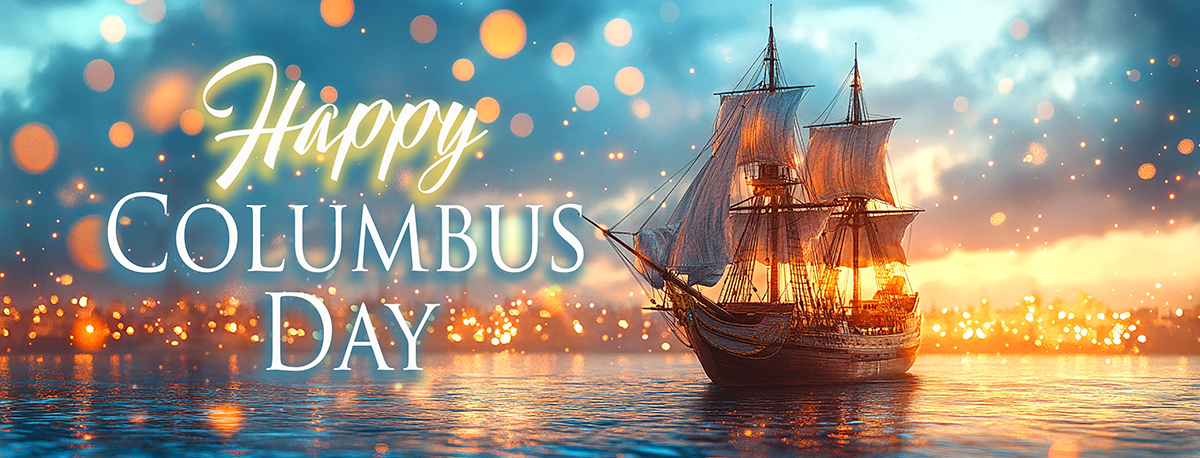 Happy Columbus Day Banner – Sailing Ship at Sunrise